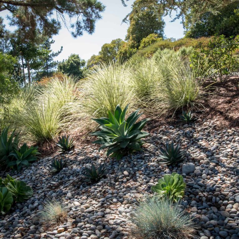 Sleek lines and bold corners create one of the coolest contemporary entries. Water-saving succulents provide texture and color to this front entryway and patio, and are low-maintenance and drought-tolerant. Big, bold succulents and grasses cover the large hillside for visual impact. Multiphase construction on this property was started in 2017 and will be completed in early 2020. The last phase of installation includes a meditation garden, updates to decks around the private pool, a lounge oasis with stairs to a fruit orchard, and all-new fencing. Check back for updated photos of Phase Two!